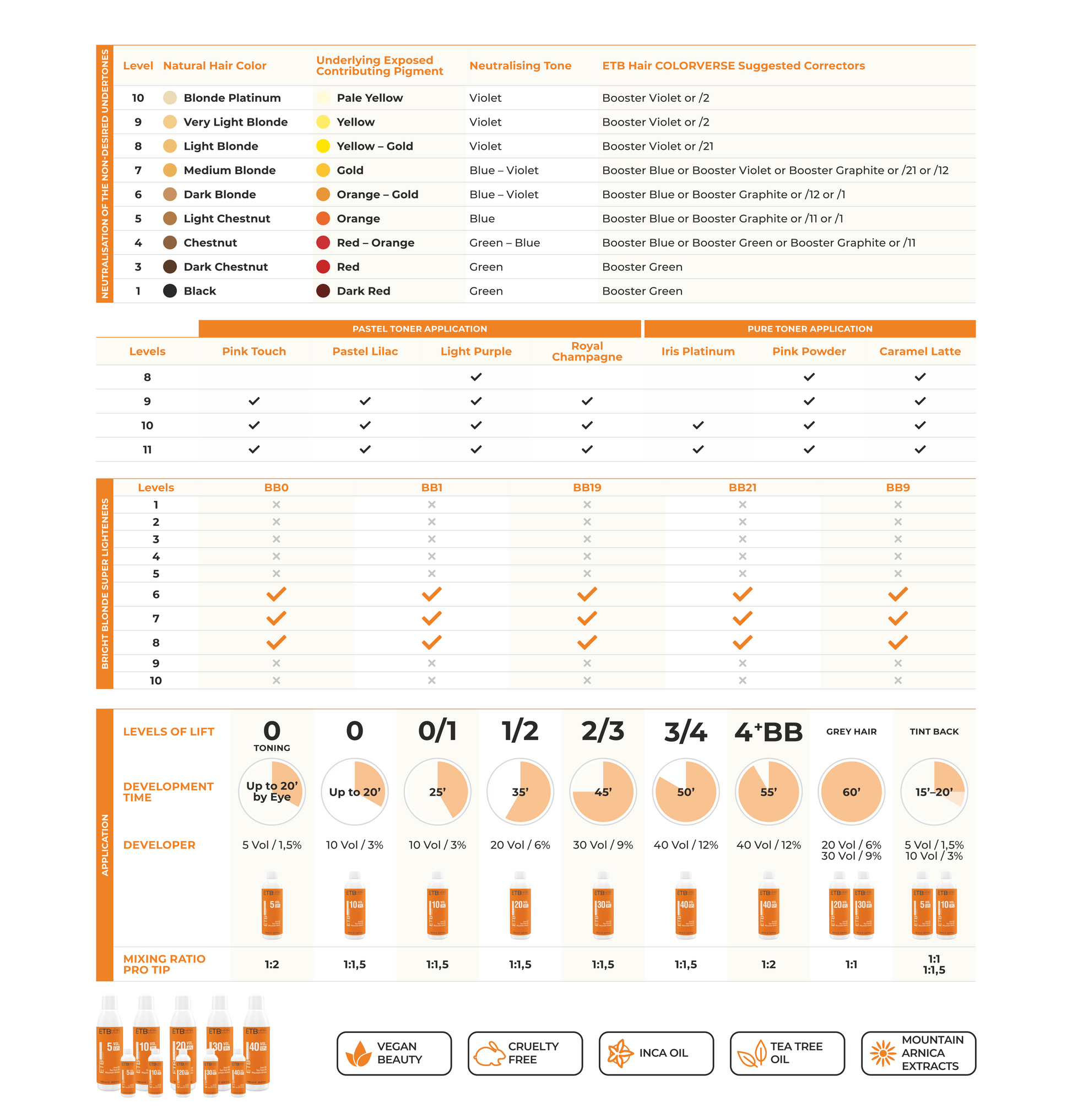 • A skálában minden árnyalat mellett megtalálni a praktikus felhasználási infókat is: melyik szín mire reagál jól, milyen előpigmentálási vagy fedési sajátosságai vannak, és milyen keverési irányt érdemes választani.